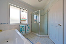 The main bathroom has a deep bath tub